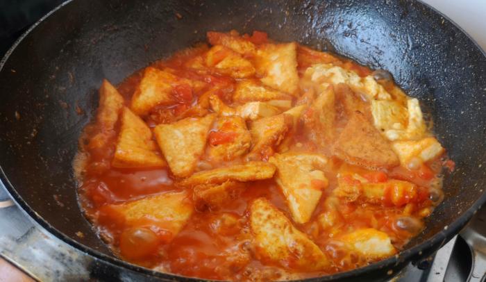 5鍋裡倒一點底油,下蔥花、蒜末爆香,然後放入切碎的西紅柿大火翻炒均勻,加少許食用鹽、白糖、蠔油,最後炒到西紅柿軟爛成泥狀,把煎好的豆腐放進去,倒半碗清水,攪動均勻,蓋上蓋子煮三分鐘。