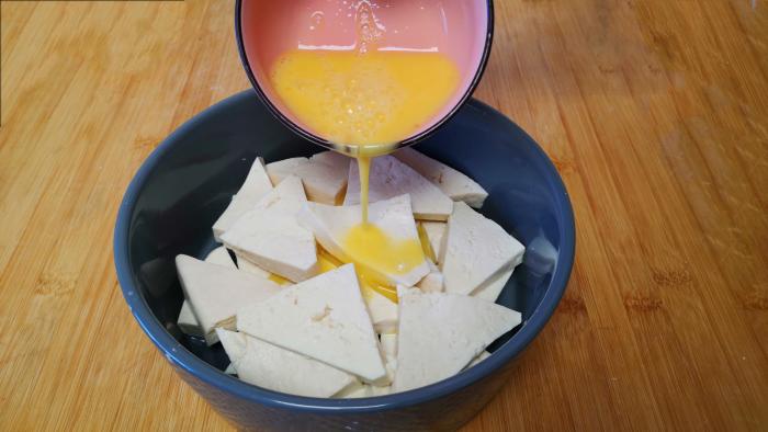3這時候再準備幾瓣大蒜,拍扁剁碎,再切點蔥花備用。然後在碗裡打兩個雞蛋,攪散。把攪散的雞蛋液淋在豆腐上,左右搖晃均勻,讓豆腐都粘上雞蛋液。